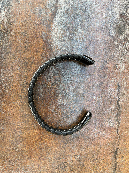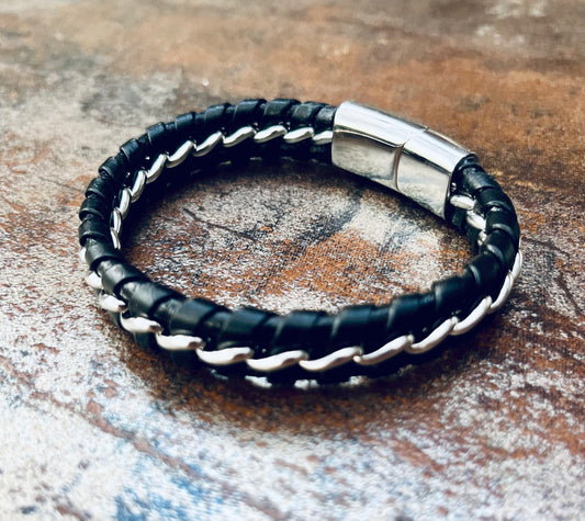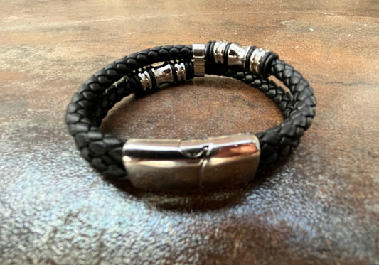Brazalete de cuero negro trenzado acero inoxidable plateado 21 cm