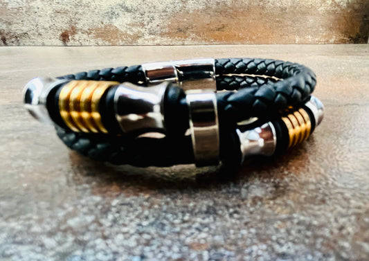 Brazalete doble de cuero acero inoxidable dorado/plateado 21 cm