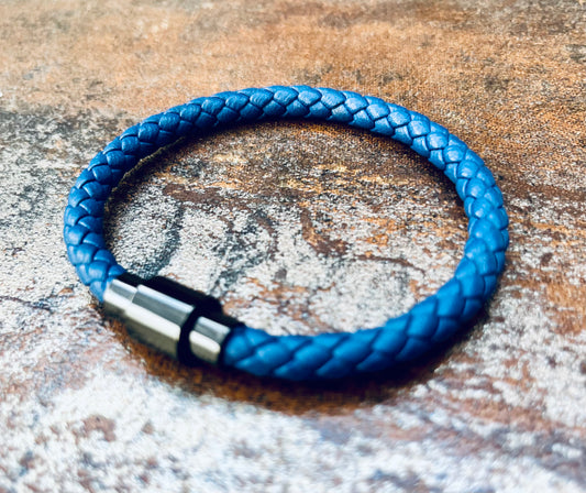 Pulsera de cuero trenzado azul con cierre de perilla 19 cm