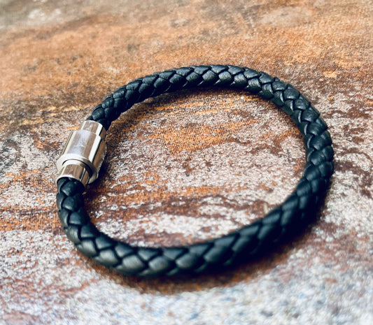 Pulsera de cuero trenzado negra con cierre de perilla plateado 19 cm