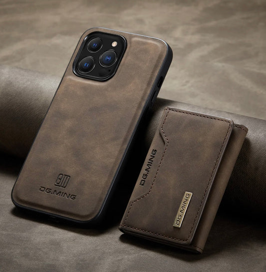Funda y cartera de cuero magnética desmontable para iPhone 14 Pro Max color Café (Coffee)
